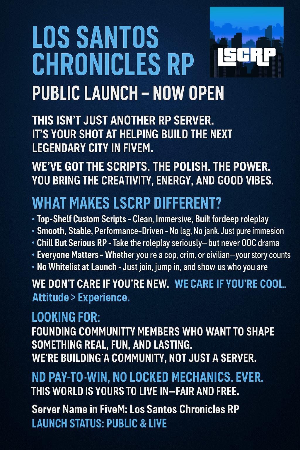 We're officially public and live, and this isn’t just another RP server. It’s your chance to help shape the next legendary city in FiveM. With top-shelf custom scripts, smooth performance, and a chill but serious RP environment, we’re here to build something real and lasting—with you.